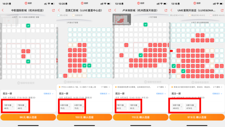 从票价上看,卢米埃影城、百美汇影城和中影国际影城的按摩椅座与普通座一致,而UME影城,两者相差了2块钱。