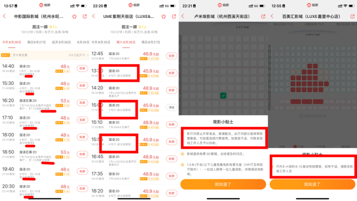 比如,UME紫荆天街店共10个厅,APP显示有3个厅装了按摩椅。而卢米埃影城(杭州西溪天街店)、百美汇影城(LUXE嘉里中心店)以及中影国际影城(杭州永旺店),每个影厅内均设有按摩椅。