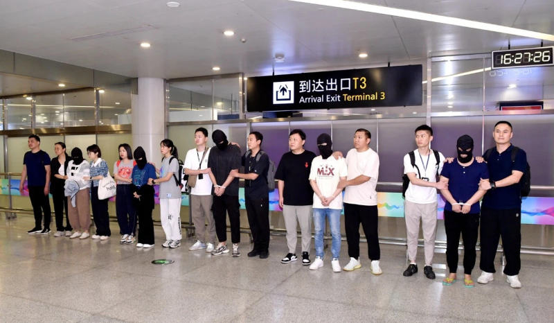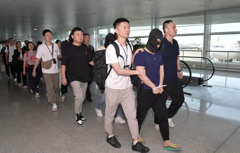 新京报记者从浙江省公安厅获悉,8月26日下午4时,杭州萧山国际机场,5名电信网络诈骗犯罪嫌疑人被浙江警方押解抵达杭州。