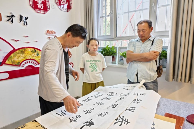 书法爱好者在教社区孩子们写毛笔字(水磨沟区融媒体中心供图)
