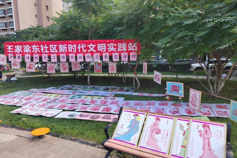8月24日下午,南湖北路街道王家梁东社区新时代文明实践站在南湖明珠一期小广场开展传统手工剪纸、丝网花作品展览活动,吸引了小区大量的居民驻足围观。