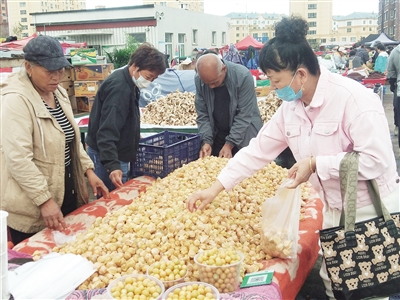 8月27日,记者来到海拉尔区新桥市场看到,色泽金黄、果实饱满的莫力达瓦达斡尔族自治旗菇娘吸引很多市民和游客前来购买品尝。一位商贩一边忙碌一边对记者说:“今年菇娘喜迎丰收,走俏市场,一上市就受到市民游客的欢迎,价格在每公斤24元左右,现在每天都能卖出100多公斤,而且有不少外地游客通过线上购买,增加销售渠道,开拓了销售市场,反响很不错。”正在挑选菇娘的市民张女士说:“菇娘果香浓郁,口感酸甜风味独特,物美价廉品质更佳,是绿色健康食品,多买上几斤尝尝鲜,冷藏可以保存时间更久,还可以加工成罐头。”