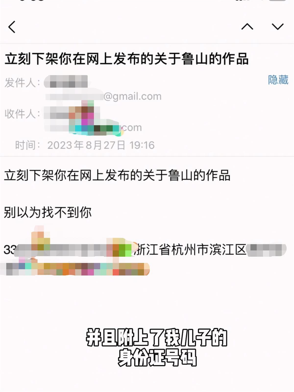 “小黑诸鸣”(下称诸鸣)是杭州一位知名导游。8月29日早上,他通过短视频网站发视频称,自己收到一份邮件,要求他删除关于鲁山县的视频,对方还称“别以为找不到你”,并附上了诸鸣的家庭地址及孩子的身份证号码。