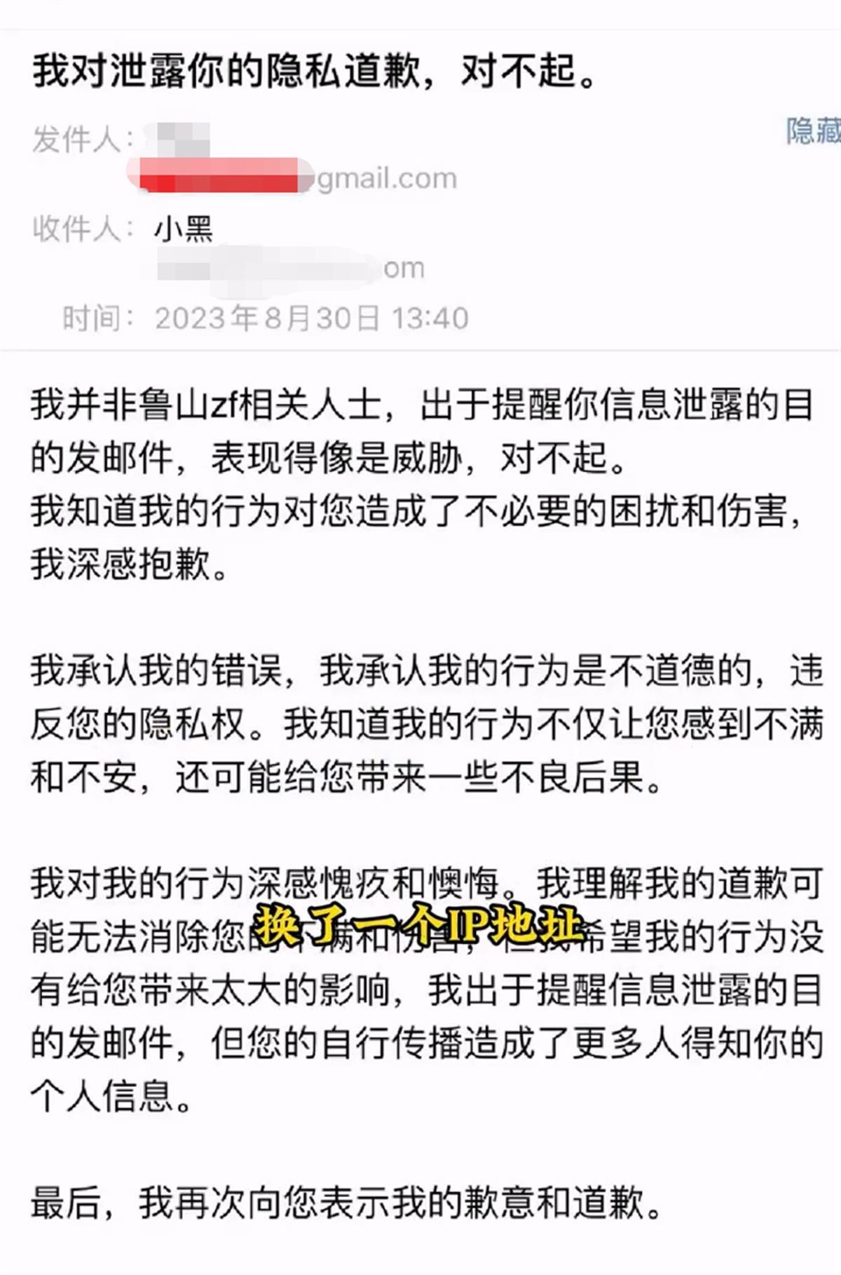 诸鸣收到威胁邮件一事引发关注后,他公开表示将会报警处理。8月30日下午,他收到另一账号发来的邮件。邮件截图显示,对方向诸鸣道歉称,自己并非鲁山县政府相关人士,出于提醒他信息泄露的目的才发邮件,表现得像是威胁,这一行为给他造成了不必要的困扰和伤害,为此深感抱歉。对方还称,诸鸣的自行传播造成了更多人得知他自己的个人信息。