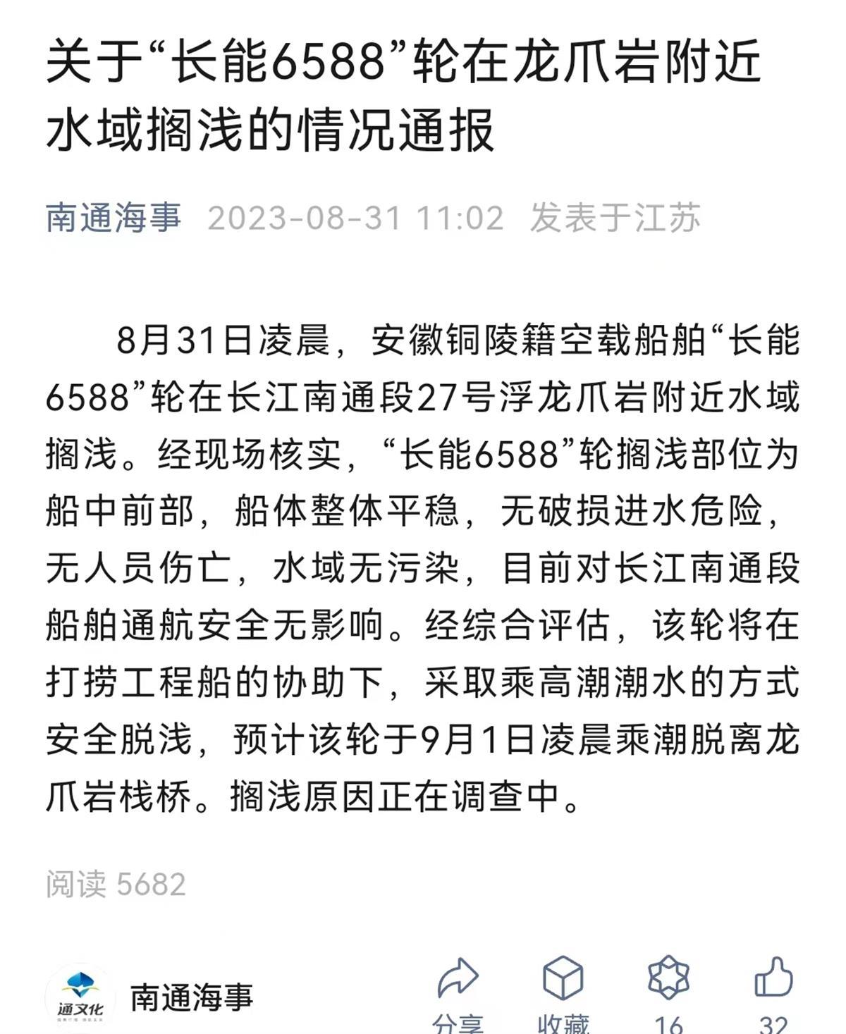 31日,南通海事微信公众号发布了《关于“长能6588”轮在龙爪岩附近水域搁浅的情况通报》通报称,8月31日凌晨,安徽铜陵籍空载船舶“长能6588”轮在长江南通段27号浮龙爪岩附近水域搁浅。经现场核实,“长能6588”轮搁浅部位为船中前部,船体整体平稳,无破损进水危险,无人员伤亡,水域无污染,目前对长江南通段船舶通航安全无影响。经综合评估,该轮将在打捞工程船的协助下,采取乘高潮潮水的方式安全脱浅,预计该轮于9月1日凌晨乘潮脱离龙爪岩栈桥。搁浅原因正在调查中。(视频来源:自由の呼吸)