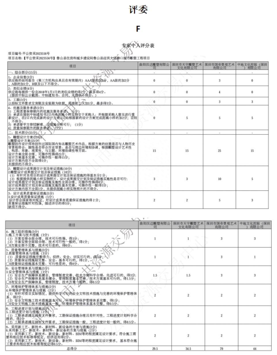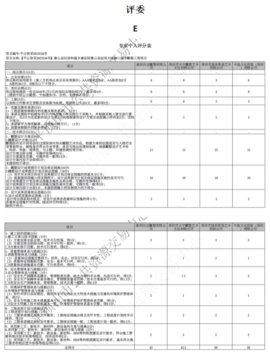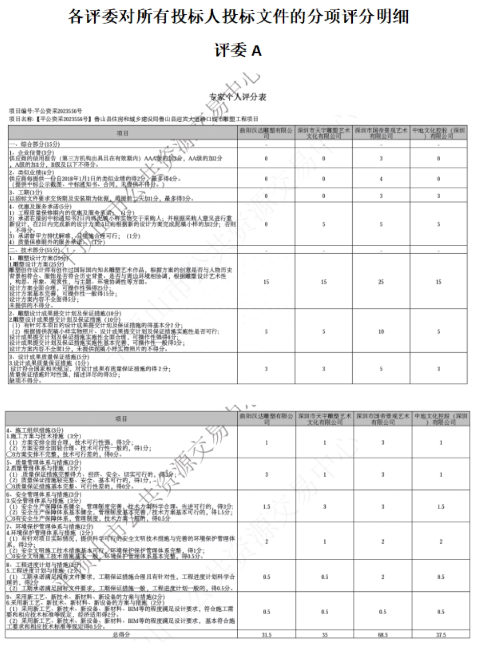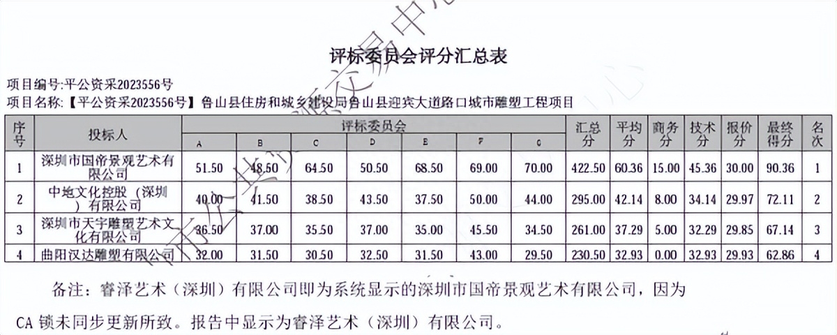 澎湃新闻获得的相关项目各评委对所有投标人投标文件的分项评分明细表显示,7名评委有4人认为睿泽艺术(深圳)有限公司(更名前为深圳市国帝景观艺术有限公司)的雕塑设计方案全面合理、可操作性强,在这分值最高的单项里给出25分满分。另有3名评委则认为睿泽艺术的设计方案基本完善、可操作性一般,给了15分,和其余3家公司的得分一样。