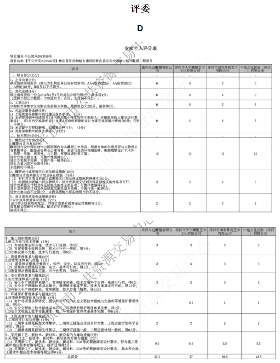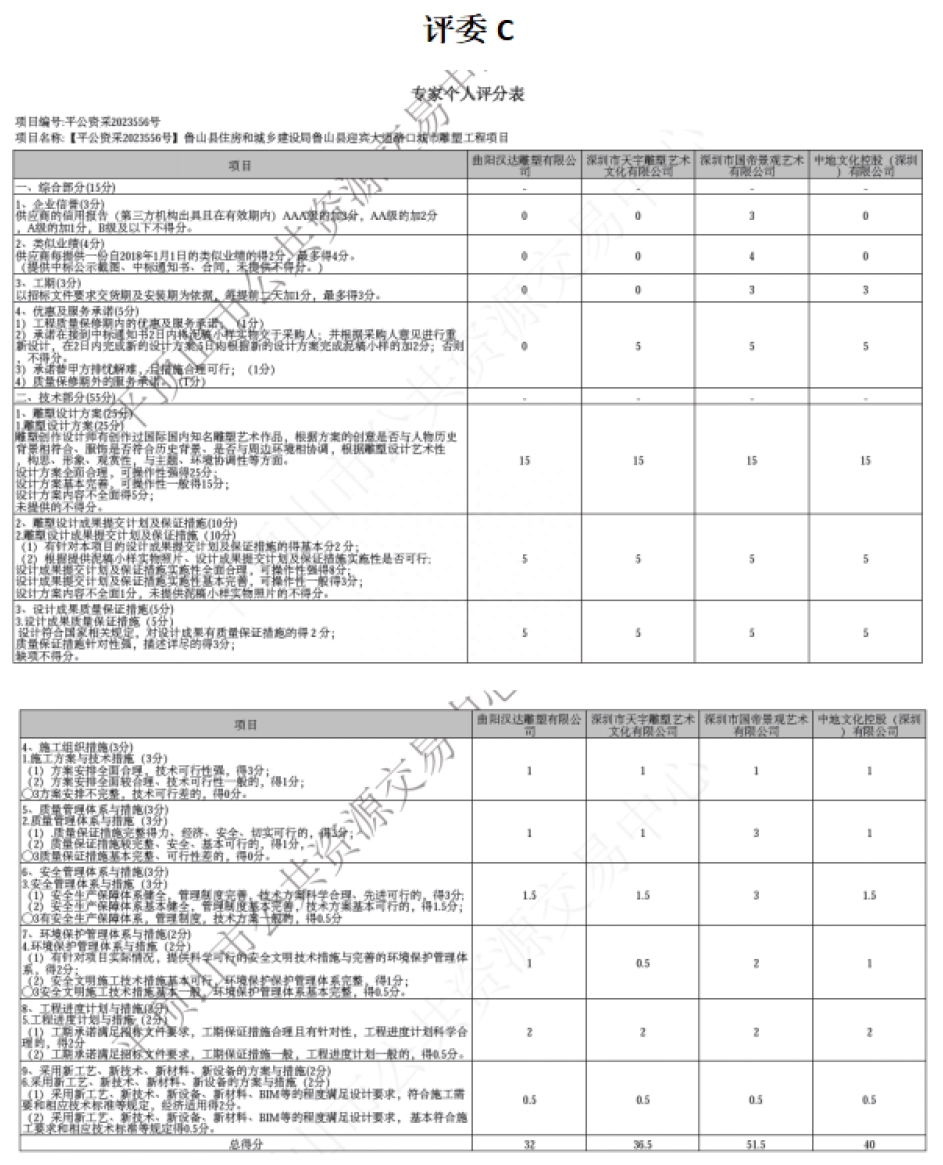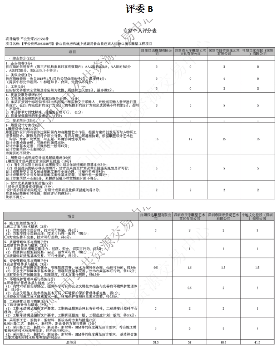 澎湃新闻获得的相关项目各评委对所有投标人投标文件的分项评分明细表显示,7名评委有4人认为睿泽艺术(深圳)有限公司(更名前为深圳市国帝景观艺术有限公司)的雕塑设计方案全面合理、可操作性强,在这分值最高的单项里给出25分满分。另有3名评委则认为睿泽艺术的设计方案基本完善、可操作性一般,给了15分,和其余3家公司的得分一样。