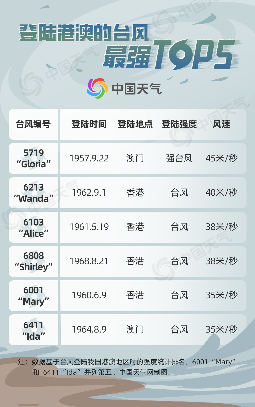 中国天气网盘点登陆港澳地区的台风实力榜显示,排行第一的是1957年第19号台风“Gloria”,于9月22日以强台风级别登陆澳门,当时它制造的强风雨导致澳门低洼地区出现水浸,一艘渔船沉没,酿成2死5伤;第二名是1962年第13号台风“Wanda”,9月1日以台风级别登陆香港,为1949年以来登陆香港最强的台风,造成严重伤亡。