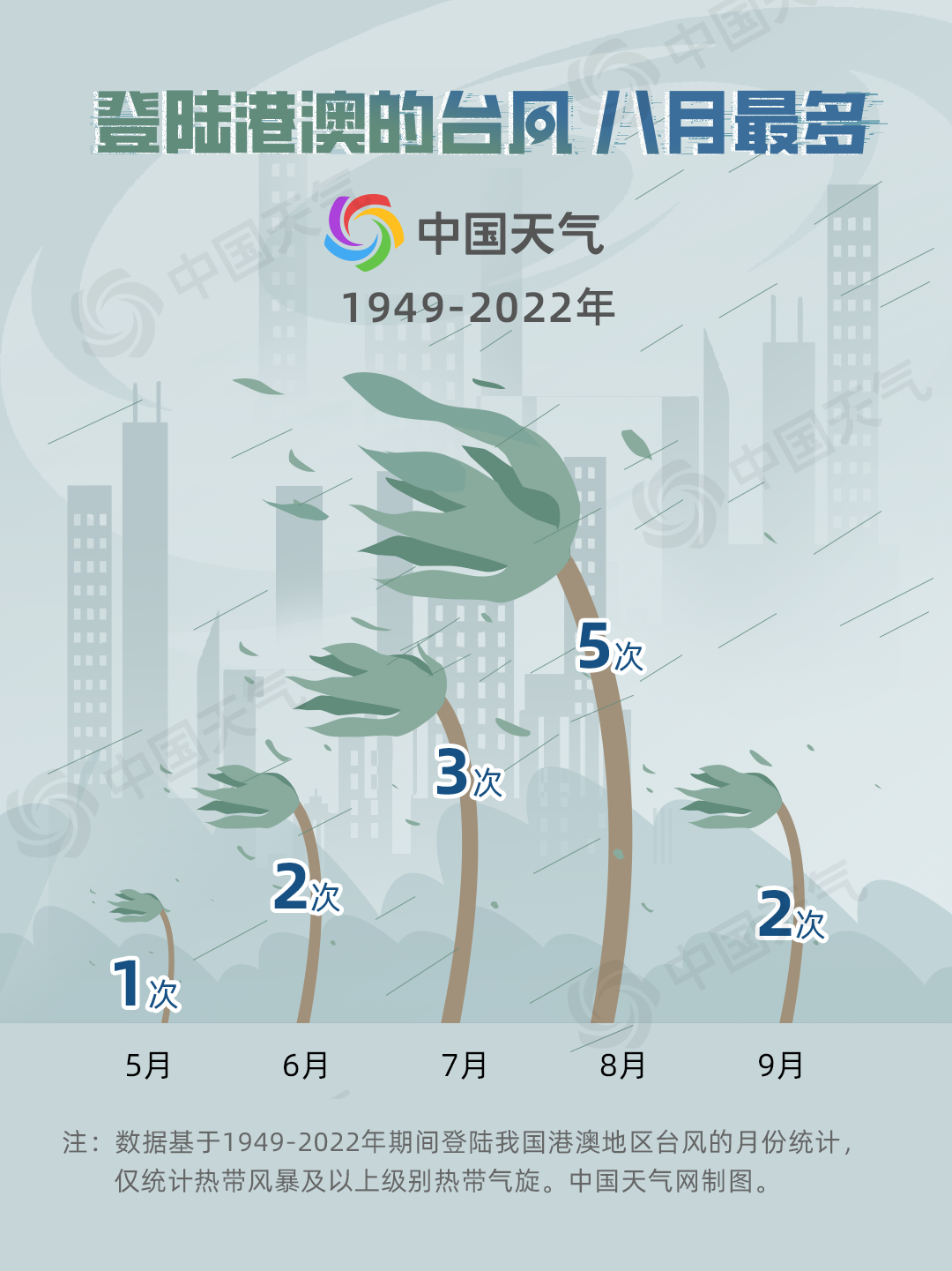 香港和澳门地处我国华南沿海,夏秋两季台风都较为活跃,影响时段较为广泛,但总个数并不算多。中国天气网盘点大数据发现,1949年至2022年间共有13个台风登陆香港和澳门(香港11个,澳门2个)。从登陆时间看,5到9月都曾有台风登陆过,其中,8月为密集期,共有5个台风登陆。
