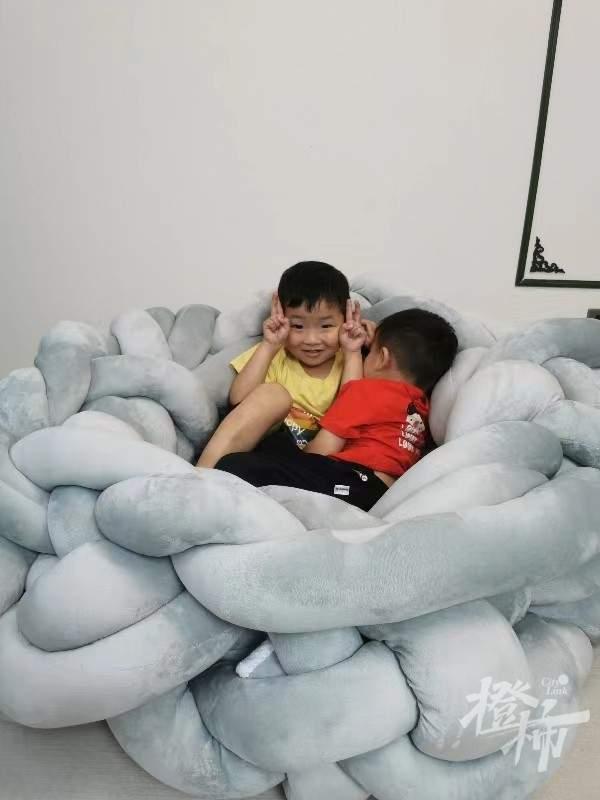 要说这其中最耗费心血的,一定是“鸟巢沙发”。这个沙发来头不小,是国外大牌设计师的设计,售价高达26万元。为了节约成本,陈卢郎把家中废弃的抱枕拆了个遍,拆出了足量的棉花,再通过一针一线纯手工缝制拼接,足足花了一个礼拜才将低配版的沙发做成,总共才花费80多元。