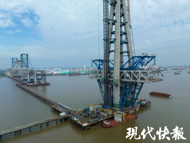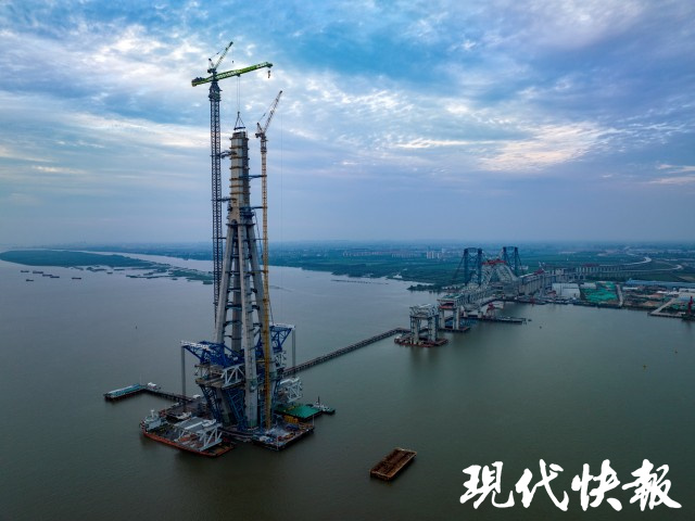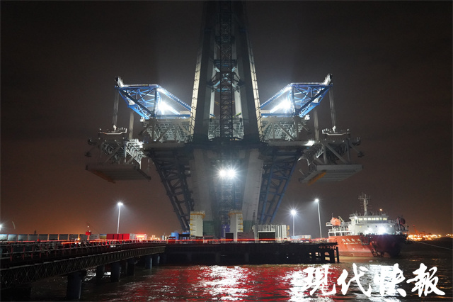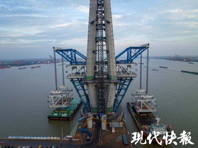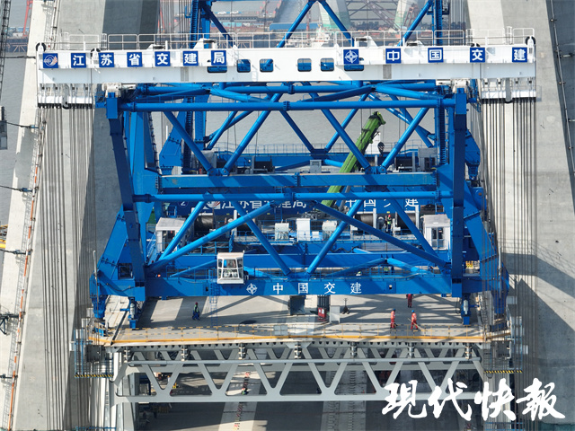 现代快报记者从中交二航局获悉,9月3日凌晨,在常泰长江大桥主航道桥,国内最大双主桁桥面吊机历经16小时,终于完成了北岸首对钢桁梁对称悬拼。这也标志着大桥钢桁梁架设迈入“快车道”。