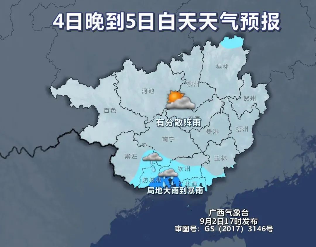 4日晚上到5日白天,防城港、钦州、北海等市有小到中雨、局地大雨到暴雨,我区其他地区多云有分散阵雨。