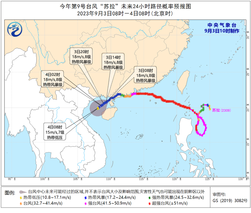 台风“苏拉”未来24小时路径概率预报图。图源中央气象台
