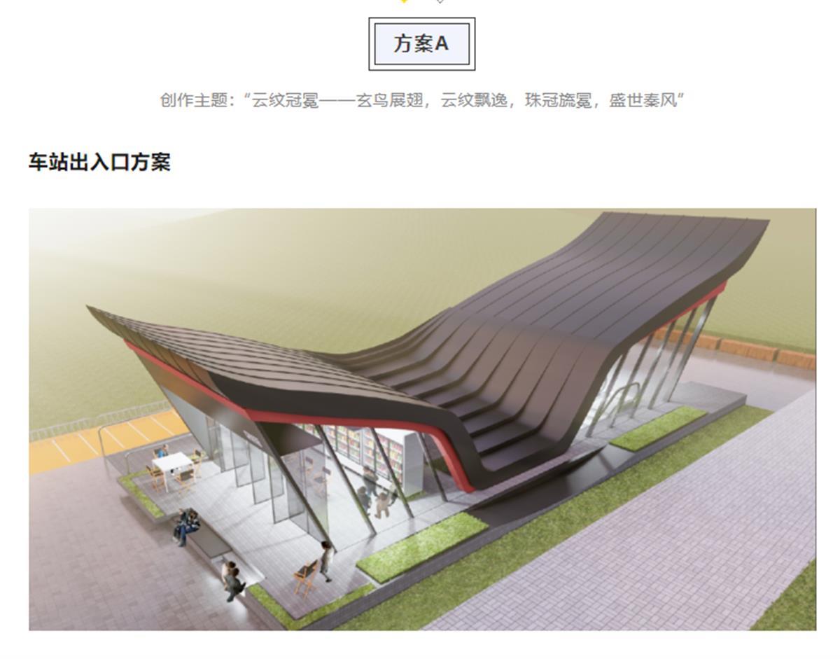 该文章中共列出了A、B两个方案,其中A方案的创作主题是“云纹冠冕——玄鸟展翅,云纹飘逸,珠冠旒冕,盛世秦风”,其展示的效果图与最终建成的地铁口造型较为相似。