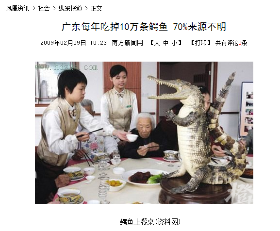 2009年,南方新闻网曾报道,近年来,鳄鱼肉的药用、保健功效被商家不断放大,这种凶猛的两栖动物作为盘中餐渐渐走俏,像有食疗传统的广东更成为全国鳄鱼消费的主要地区。
