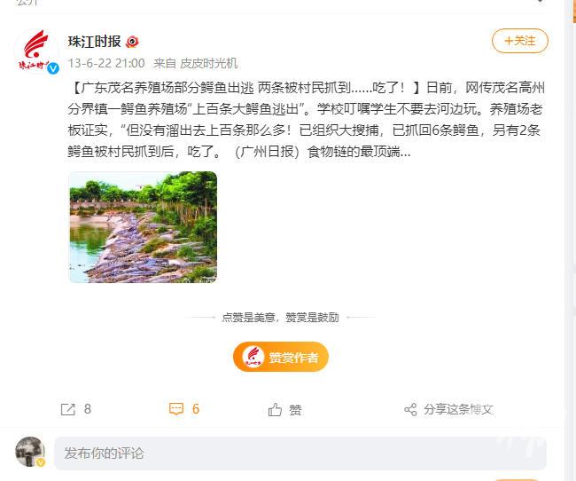 2013年,网传茂名高州分界镇一鳄鱼养殖场“上百条大鳄鱼逃出”,学校叮嘱学生不要去河边玩。