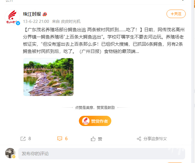 当时鳄鱼养殖场的负责人说,初步排查有6条鳄鱼出走,都是暂无攻击性的幼鳄,经过搜捕,有4条鳄鱼被捉回,2条被村民煮着吃了,出逃的鳄鱼,体重都在15公斤左右。