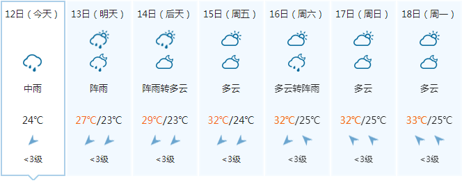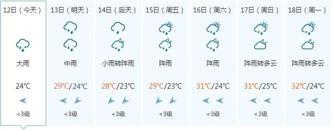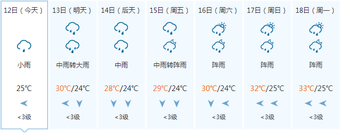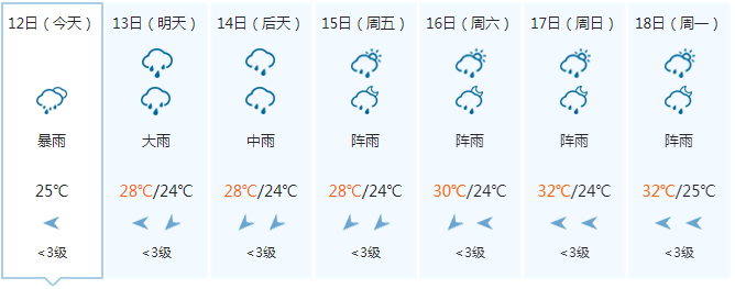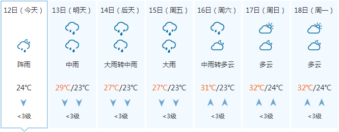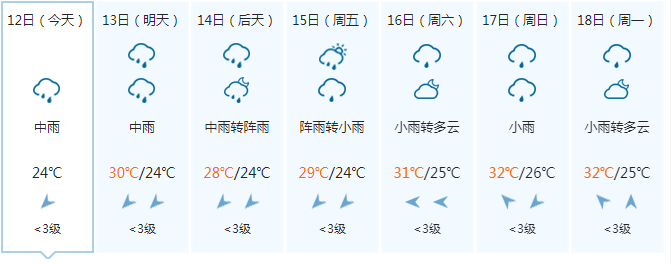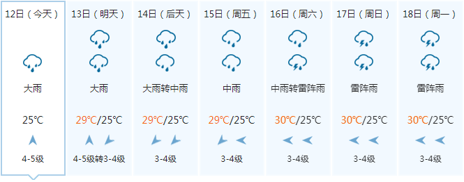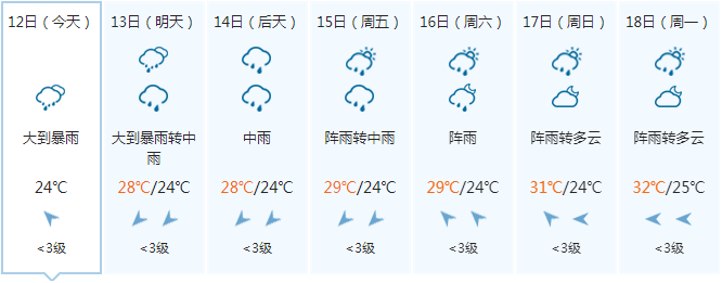 南宁市:12日晚上大雨,局地暴雨,明天白天中雨,局地大雨,偏东风2级,最低气温24℃,最高气温29℃。