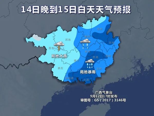 14日晚上到15日白天,桂东和沿海有中雨、局地暴雨,我区其它地区有阵雨或雷雨、局地大雨。
