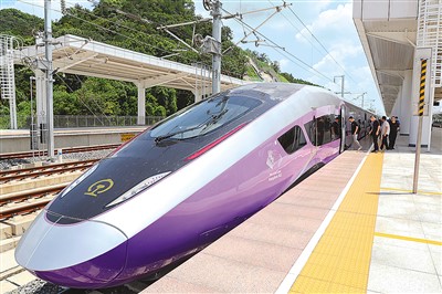 日前,G55318/9次复兴号亚运智能动车组缓缓驶入高铁德清站。列车以“润泽江南”为主题,为杭州第十九届亚运会量身定制,车身颜色为杭州亚运会主形象色“虹韵紫”。蔡俊摄(人民图片)