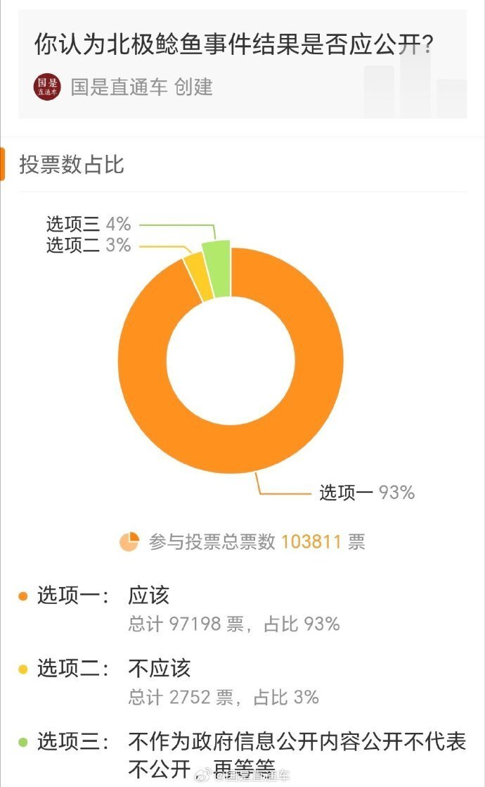 国是直通车发起的投票显示,超9成网友认为北极鲶鱼事件结果应公布。仅不到1成的网友认为不该公布。还有部分网友认为,回复中的“不作为政府信息公开内容公开”不代表不公开,可以再等等。