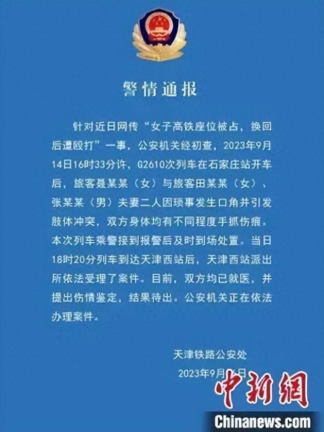 据中新网9月17日报道,北京铁路公安局天津公安处16日发布警情通报:针对近日网传“女子高铁座位被占,换回后遭殴打”一事,公安机关经初查,2023年9月14日16时33分许,G2610次列车在石家庄站开车后,旅客聂某某(女)与旅客田某某(女)、张某某(男)夫妻二人因琐事发生口角并引发肢体冲突,双方身体均有不同程度手抓伤痕。本次列车乘警接到报警后及时到场处置。当日18时20分列车到达天津西站后,天津西站派出所依法受理了案件。目前,双方均已就医,并提出伤情鉴定,结果待出。公安机关正在依法办理案件。