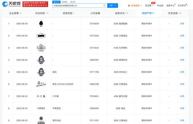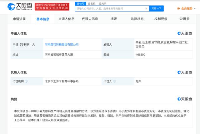 天眼查知产信息显示,莲花健康产业集团股份有限公司曾申请鸡精、味精等专利30余项,注册百余条莲花系列商标。值得一提的是,早在2001年,该公司就曾申请“用小麦为原料生产味精及其他氨基酸的方法”专利,其步骤为:用小麦为原料制成小麦淀粉乳,小麦淀粉乳经液化、糖化制成葡萄糖液,用此葡萄糖液另添加其他营养成分进行微生物发酵,进而提取、精制、烘干包装得到成品味精或其他氨基酸。此外,今年8月底,莲花味精关联的国企河南省莲花味精集团有限公司仍在申请多个不同“莲花”LOGO商标。