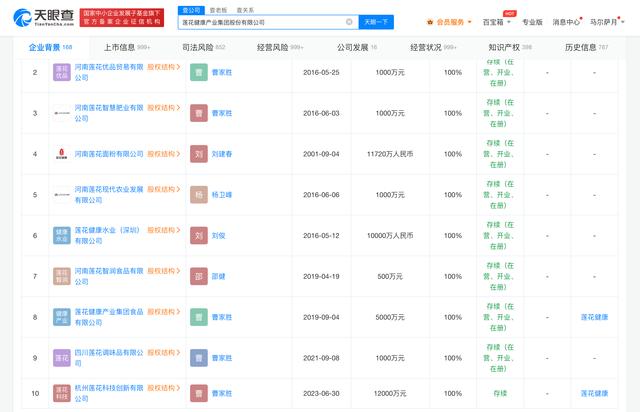 资料显示,莲花味精的前身是创建于1983年的周口地区味精厂,1996年公司整体改制为国有独资公司。天眼查App显示,莲花味精关联公司莲花健康产业集团股份有限公司成立于1998年7月,于1998年8月在A股上市,法定代表人为李厚文,注册资本约17.94亿人民币,曾用名为河南莲花味精股份有限公司。对外投资信息显示,该公司直接持股企业17家,包括河南莲花优品贸易有限公司、河南莲花面粉有限公司等。