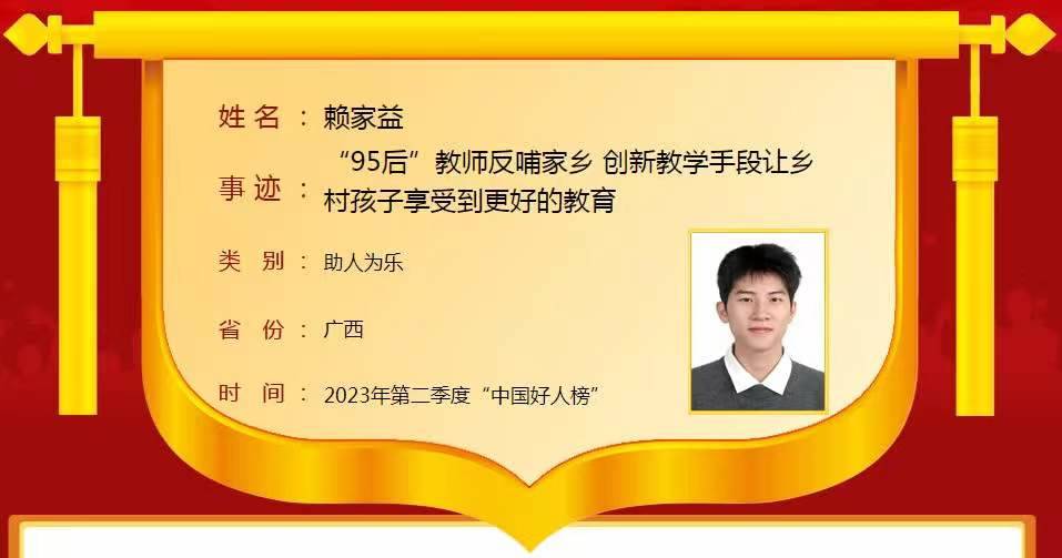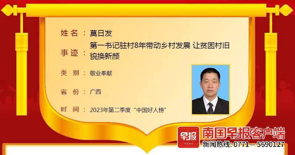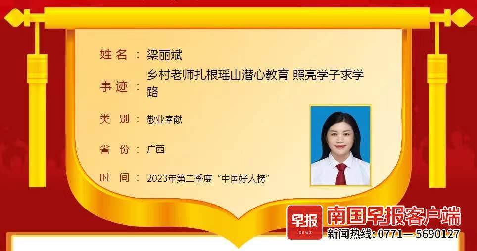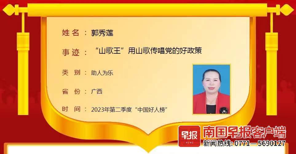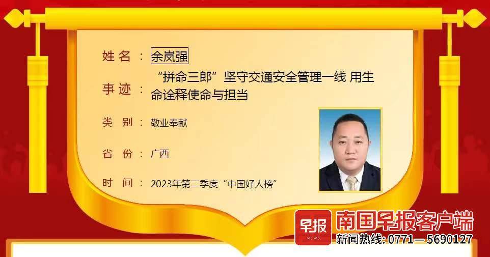 9月22日下午,中央文明办发布2023年第二季度“中国好人榜”,广西5人光荣上榜。他们是:用生命诠释使命与担当的人民公仆余岚强;用山歌传唱党的好声音的村民郭秀莲;反哺家乡守护乡村儿童的“95后”教师赖家益;让贫困村旧貌换新颜的驻村第一书记莫日发;扎根大山照亮学子求学路的乡村教师梁丽斌。