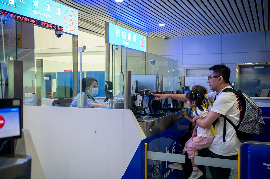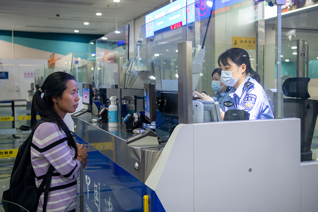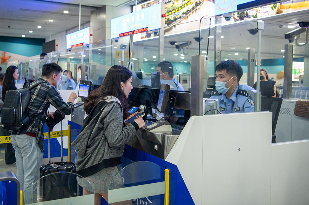 9月26日,在福州长乐国际机场出境大厅,福州机场出入境边防检查站民警为旅客办理通关手续。