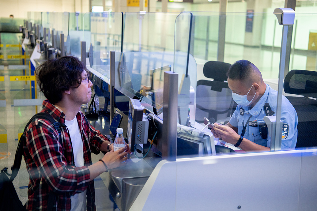 9月26日,在福州长乐国际机场入境大厅,福州机场出入境边防检查站民警为旅客办理入境通关手续。