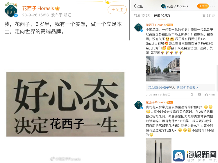 9月26日下午,因李佳琦直播言论不当被连带卷入争议的花西子品牌突然发布微博:“我,花西子,6岁半,我有一个梦想,做一个立足本土,走向世界的高端品牌。”在该条微博的评论区里,花西子开启了疯狂输出模式:“我这一代就是要以高端之势在国际市场上厮杀!”“真的有人会拿克重去衡量眉笔的价值吗?”“受排挤是我的命运”“人哪有不疯的,硬撑罢了”……花西子官博突如其来的“发疯”言论再引热议,当晚便登顶微博热搜。