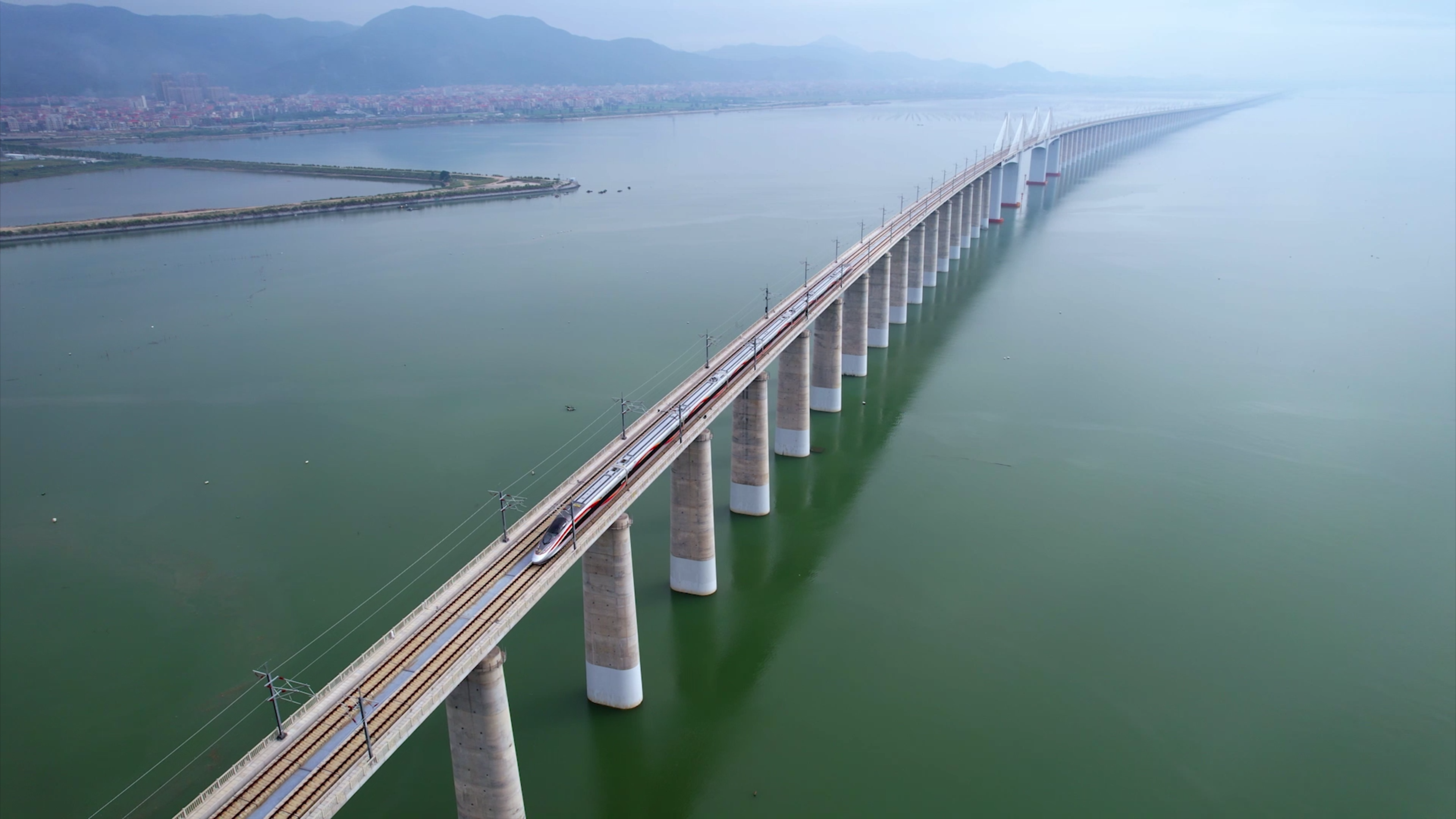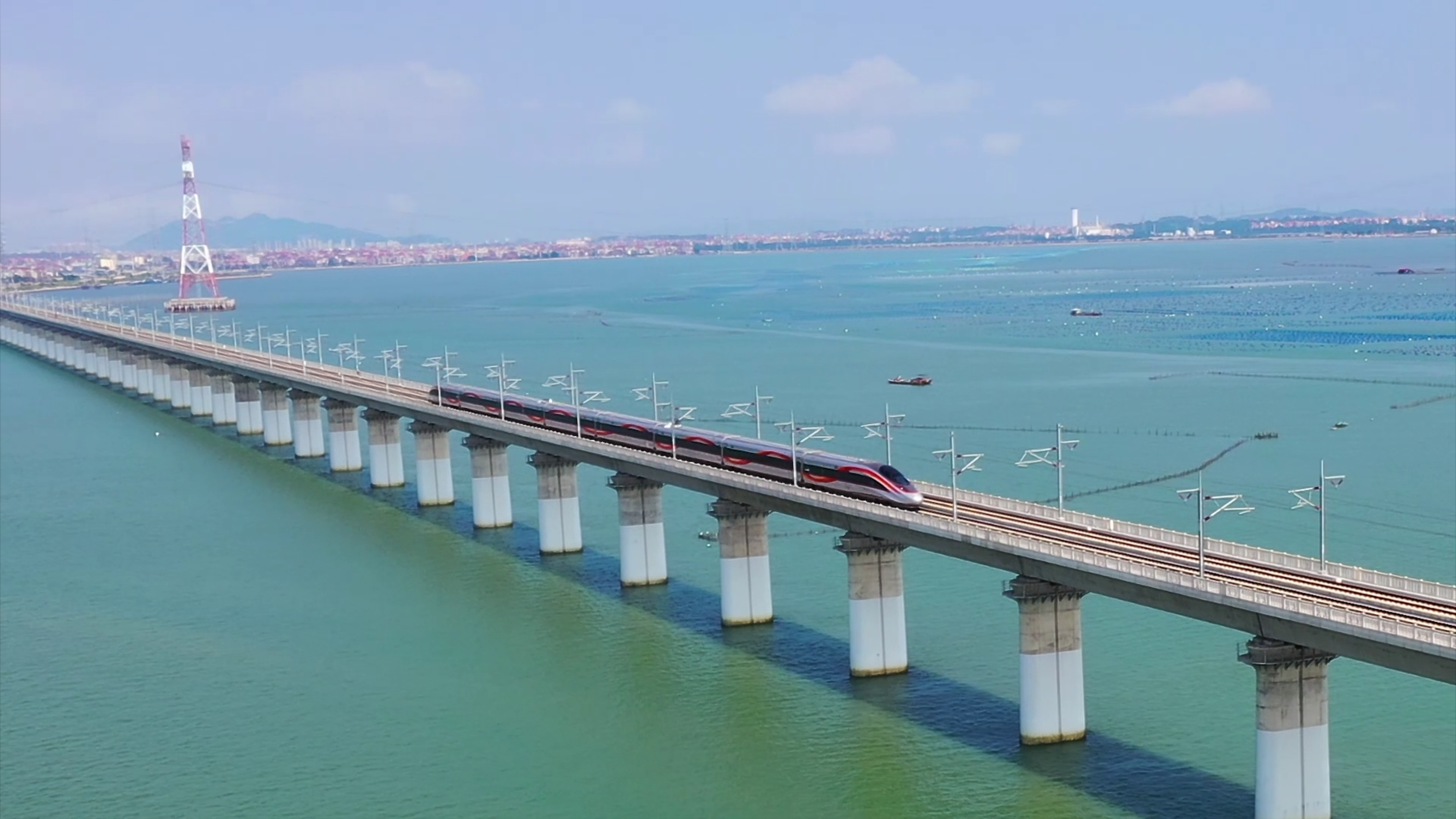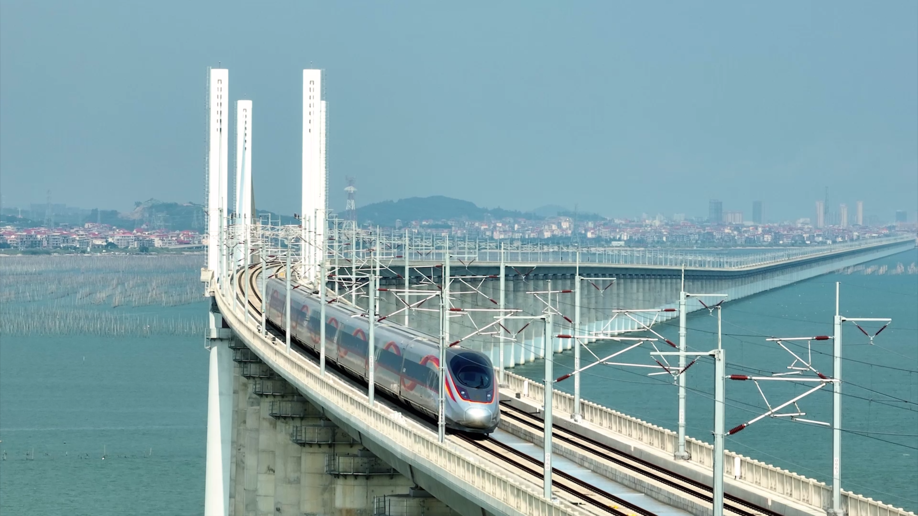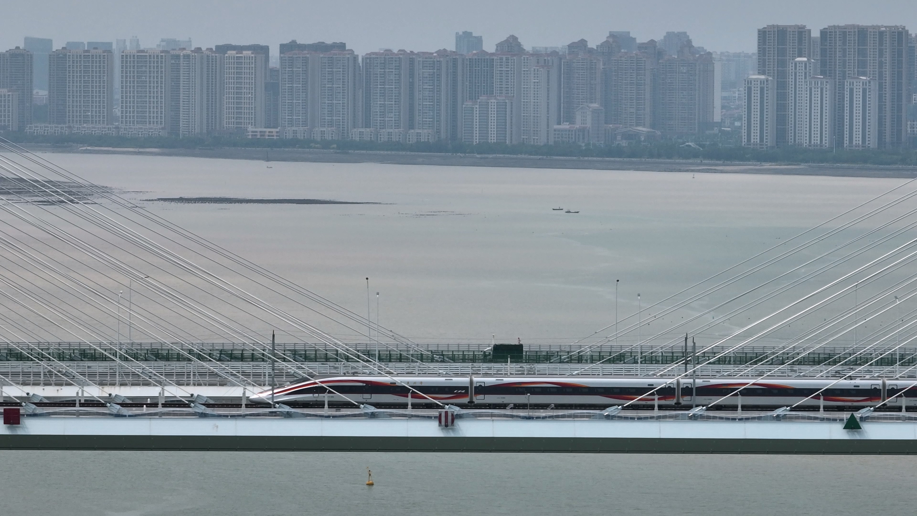 复兴号智能动车组列车正在通过福厦高铁泉州湾跨海大桥主塔。李金明摄