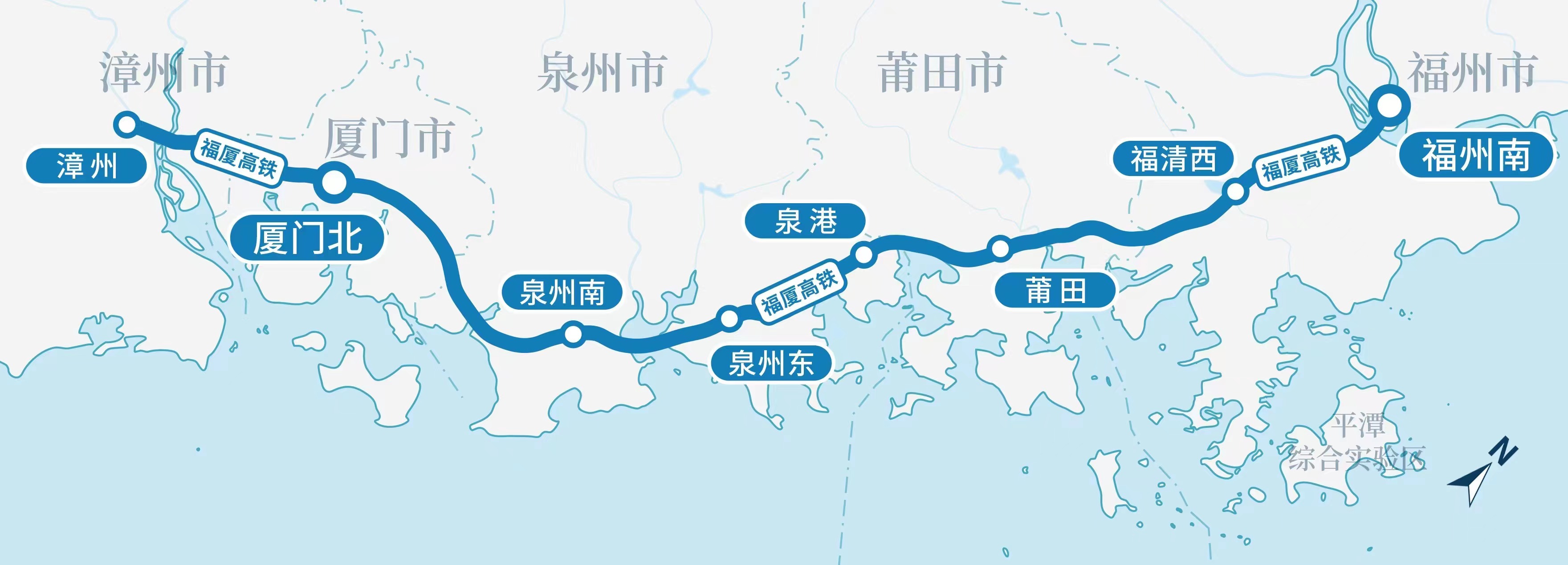 作为我国“八纵八横”高速铁路网沿海通道的重要组成部分,福厦高铁起自福州南站,经福建省莆田市、泉州市、厦门市、漳州市,接入漳州站,线路全长277公里,设有福州南、泉港、泉州东、厦门北、漳州等8座车站,将东南沿海城市群串联起来,形成福州、厦门“一小时交通圈”,厦门、漳州、泉州“半小时交通圈”。