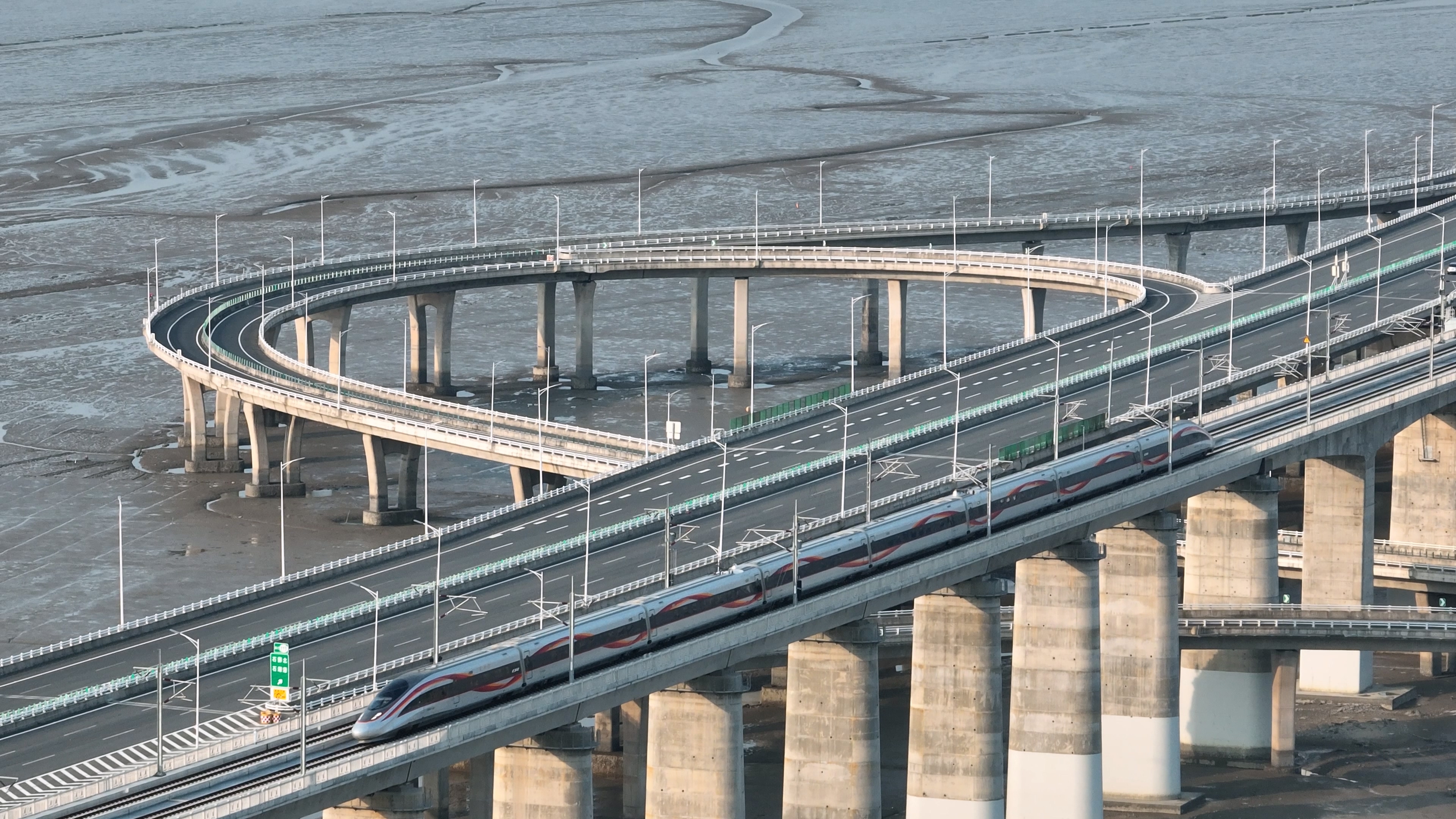 复兴号智能动车组列车行驶在福厦高铁泉州湾跨海大桥上,与公路桥交汇。李金明摄