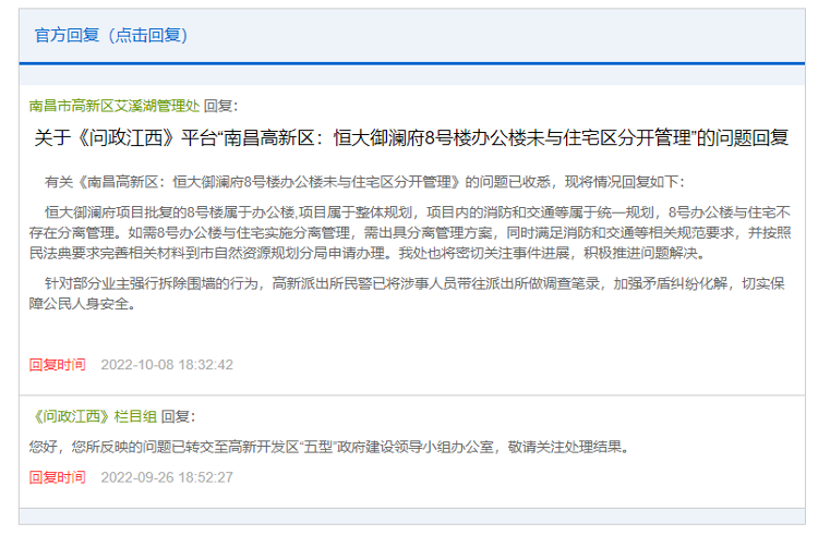 而在此帖下方,南昌市高新区艾溪湖管理处则回复称:恒大御澜府项目批复的8号楼属于办公楼,项目属于整体规划,项目内的消防和交通等属于统一规划,8号办公楼与住宅不存在分离管理。如需将8号办公楼与住宅实施分离管理,需出具分离管理方案,同时满足消防和交通等相关规范要求,并按照民法典要求完善相关材料后到市自然资源规划分局申请办理。艾溪湖管理处将密切关注事件进展,积极推进问题解决。针对部分业主强行拆除围墙的行为,高新派出所民警已将涉事人员带往派出所做调查笔录,加强矛盾纠纷化解,切实保障公民人身安全。