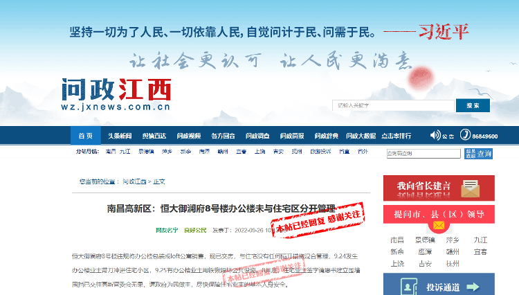 记者注意到,关于恒大御澜府小区业主与8号楼的矛盾,早在2022年9月26日,就曾有网友在“问政江西”官网反映过,该网友称,恒大御澜府8号楼违规将办公楼包装成loft公寓销售,现已交房,与小区住宅没有任何隔开措施并且混合管理,9月24日有办公楼业主带刀冲进住宅小区,9月25日又有办公楼业主用铁锹毁坏公共设施,8月底,住宅区业主签字请愿建立围墙围挡,交高新区管委会后无果,希望政府为民做主,保障住宅区业主的人身安全。