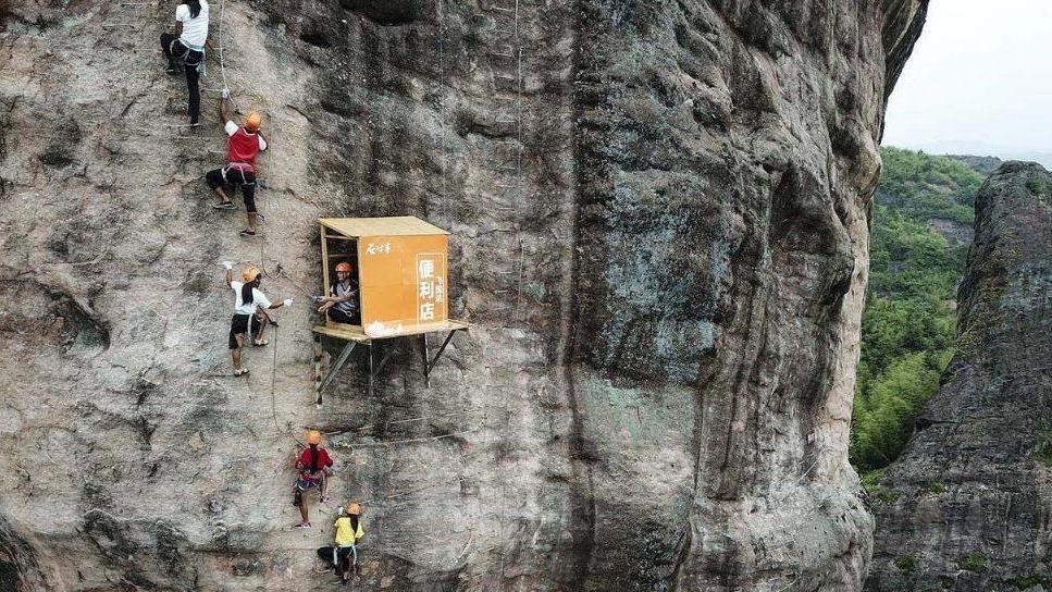 近日,一段“最不便利的便利店”视频引发网友热议,视频显示,在一座几乎垂直于地面的悬崖处,有一个小屋被安置在崖壁上,不少攀岩者从这个小屋经过时,可从小屋内的工作人员处获得饮料等补给。