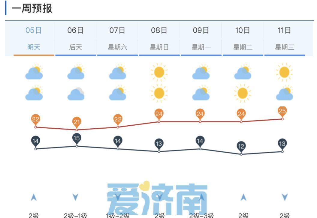 7日多云转晴,南风2~3级,最低气温济阳区、商河县、南山区、起步区11℃左右,市区及其它区县14℃左右,最高气温22℃左右。