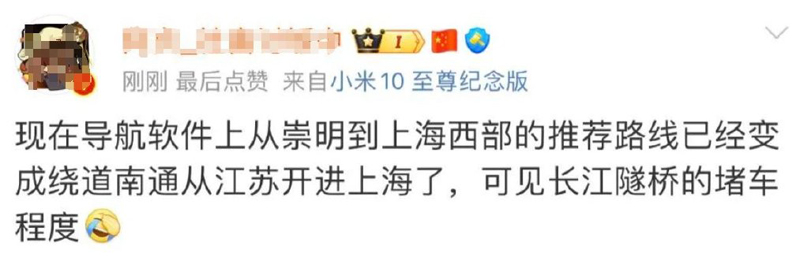 10月5日,一名上海崇明的网友发文表示, 自己想从崇明到上海西部,不过导航软件上的推荐路线已经变成了绕道南通从江苏开进上海,可见长江隧桥的堵车程度。现代快报记者检索发现,从崇明返回上海市区,最近的路线就是经G40沪陕高速走上海长江大桥和上海长江隧道过江,不过据导航软件显示,这两座隧桥长时间处于拥堵状态。而要想绕行江苏南通,较近的线路则是经海太汽渡或者G15沈海高速走苏通大桥过江。