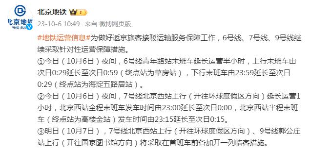 ②今日(10月6日)夜间,7号线北京西站上行(开往环球度假区方向)延长运营1小时,北京西站全程末班车发车时间由23:00延长至次日0:00,北京西站半程末班车(终点站为高楼金站)发车时间由23:15延长至次日0:15。