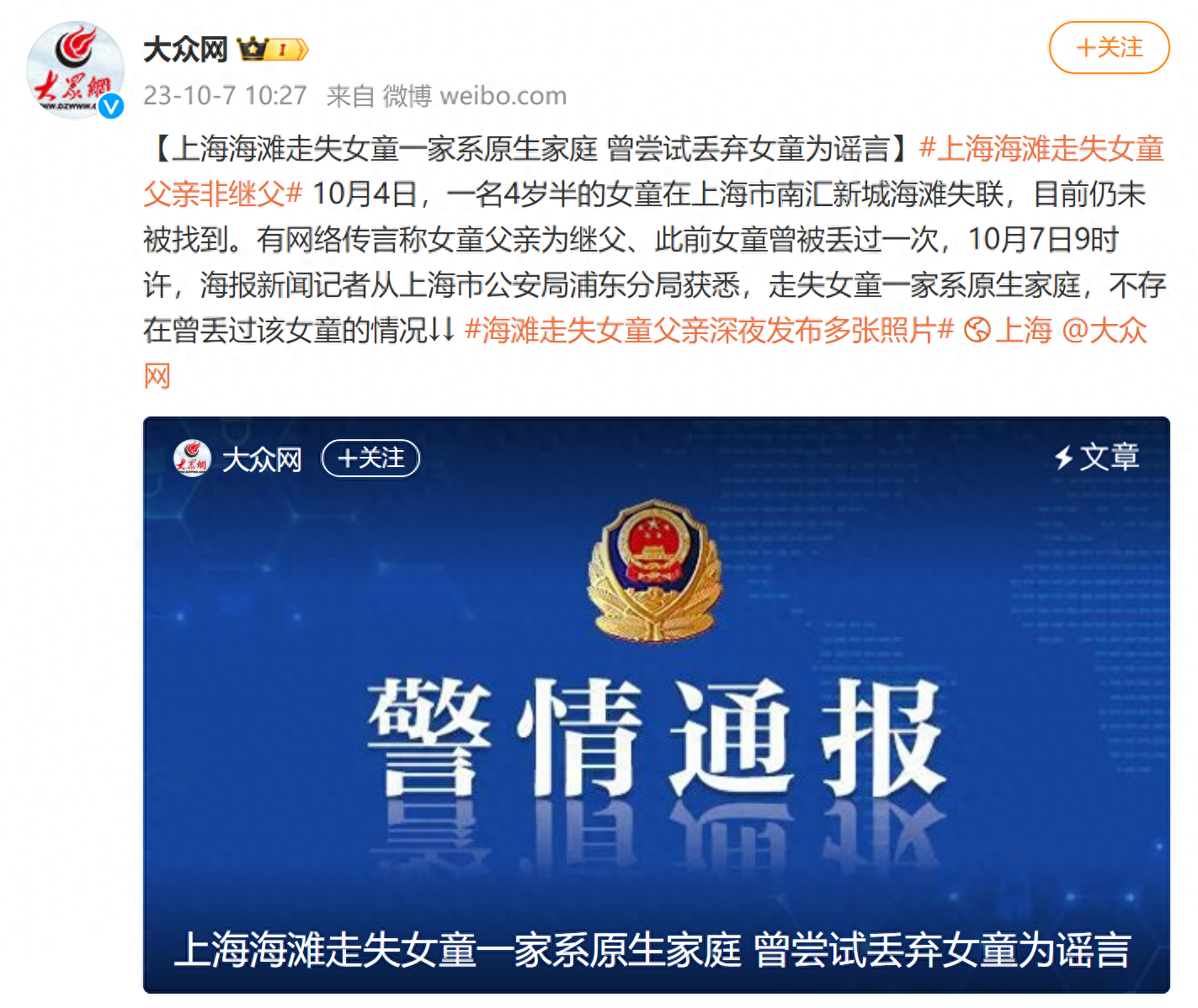 有网络传言称女童父亲为继父、此前女童曾被丢过一次,10月7日9时许,海报新闻记者从上海市公安局浦东分局获悉,走失女童一家系原生家庭,不存在曾丢过该女童的情况。
