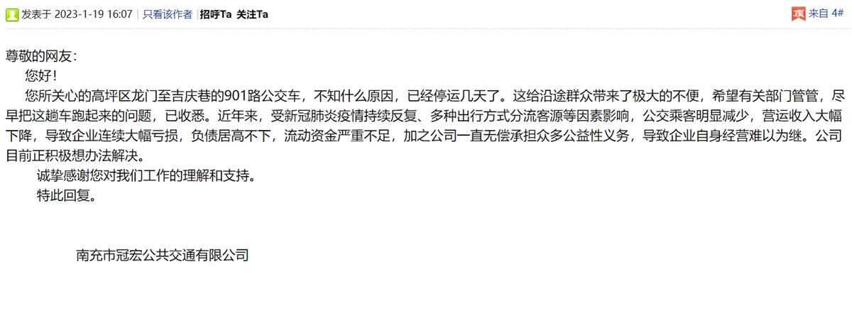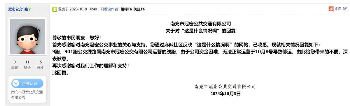 在网上问政平台麻辣社区,也有网友就网传文件向冠宏公司咨询。该公司于10月8日回复称:“9路,901路公交线路属南充市冠宏公交有限公司运营的线路,由于公司资金困难,无法正常运营于10月8号导致停运,由此给您带来的不便,深表歉意。”