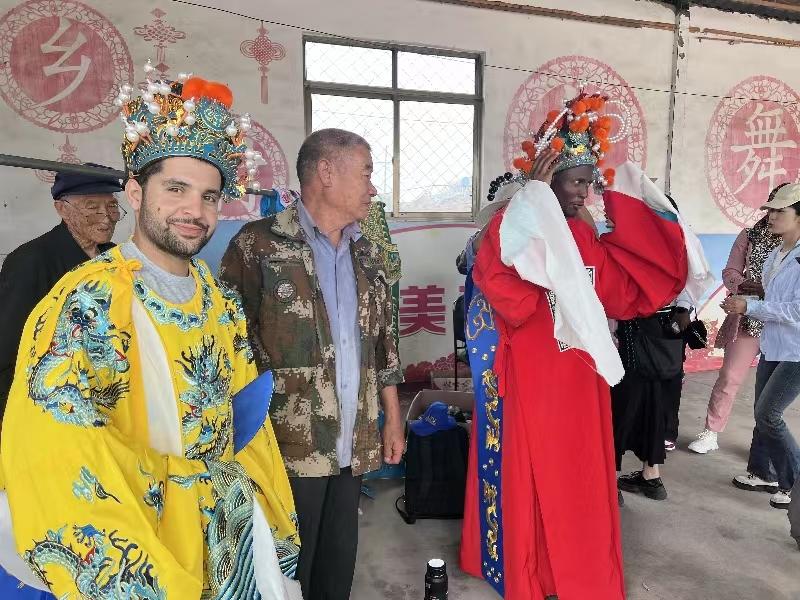 听京剧、穿戏装,近日,临沭县举行“走读山东|外国友人体验感知临沭”主题活动,来自摩洛哥、阿富汗、刚果、几内亚等国家的萨马尔、马宝玉、尚熙栋、诺哈等10位临沂大学外国留学生,来到临沭县石门镇大岱村,观看民间京剧团带来的京剧表演,沉浸式感受传承千年的国粹魅力。