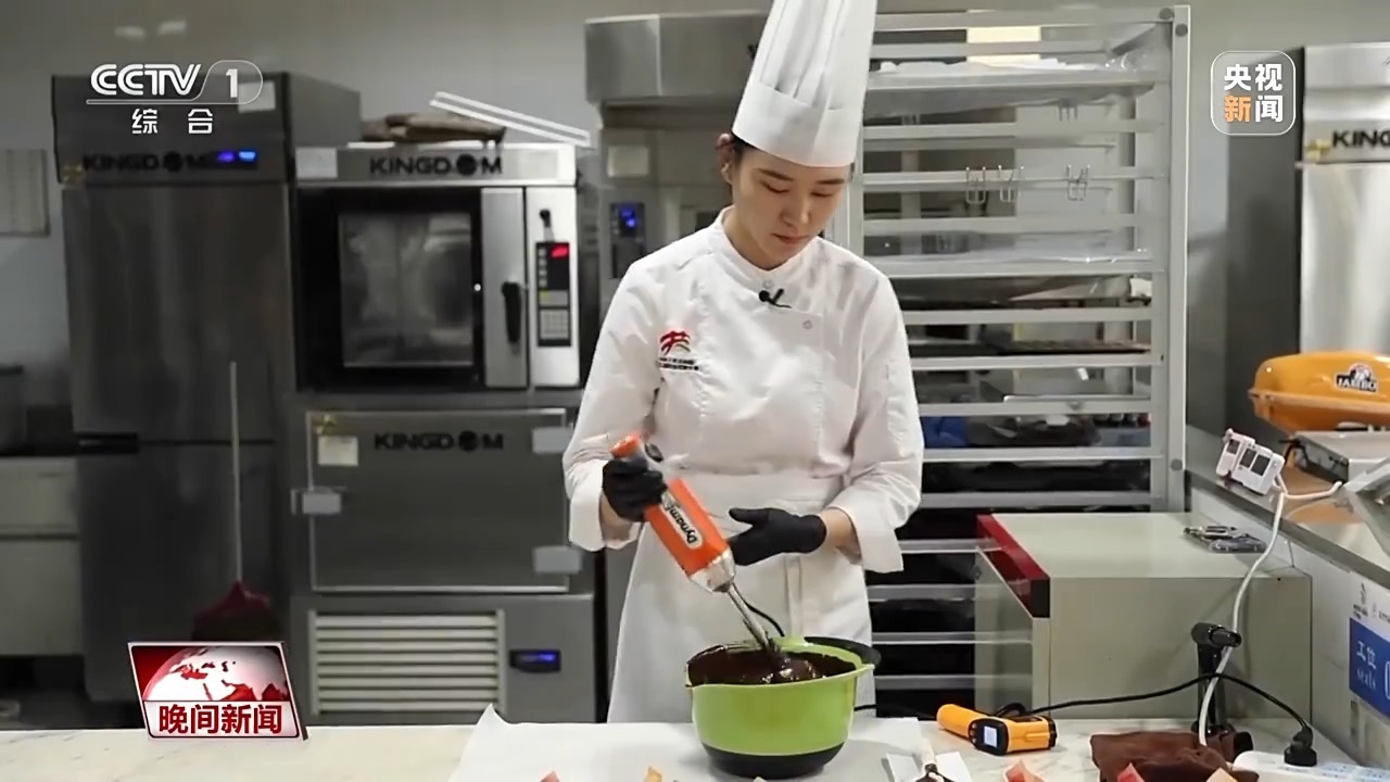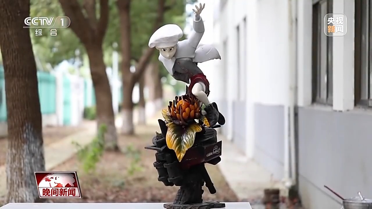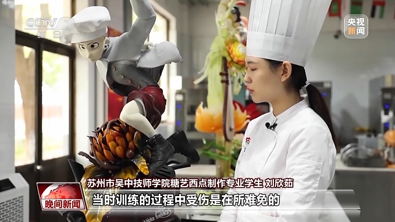 苏州市吴中技师学院糖艺西点制作专业学生刘欣茹:它下面是一个炉子,然后上面是一个比较年轻化的厨师,做的时候其实拼装挺难的,当时训练的过程中受伤是在所难免的,像我们装巧克力的时候,也会用火枪,一不小心就会把手给烫伤。