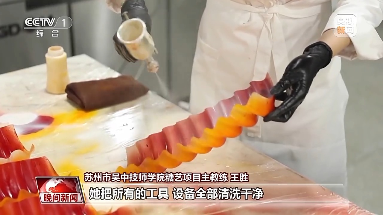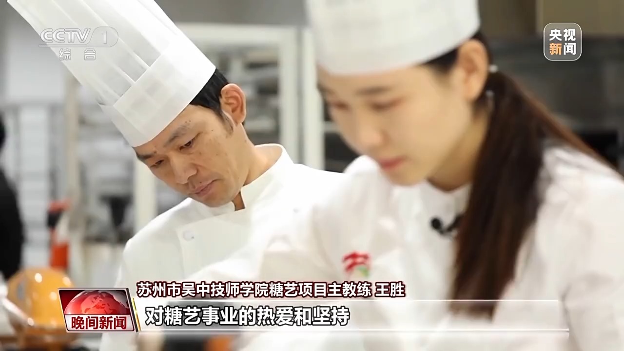 苏州市吴中技师学院糖艺项目主教练王胜:做到后面的时候,她都是有一点出现肩周炎之类的,她要去做理疗了,还一直在坚持。作为一个老师,真的看到一个新生代的糖艺师对糖艺事业的热爱和坚持。