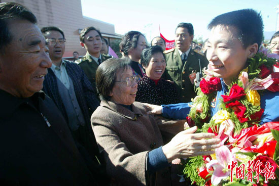 2003年10月16日,北京航天城,杨利伟的父母迎接凯旋的儿子。10月15日,杨利伟乘中国第一艘载人飞船神舟五号进入太空,成为我国第一位“太空人”。柴继军/摄