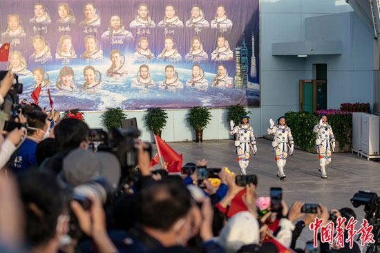 2023年5月30日早上,酒泉卫星发射中心问天阁圆梦园广场,航天员景海鹏(中)、朱杨柱(右)、桂海潮准备参加神舟十六号载人飞行任务航天员乘组出征仪式。此次任务是空间站应用与发展阶段首个载人飞行任务。中青报·中青网记者李隽辉/摄