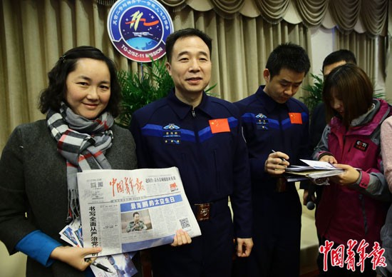 2016年12月7日,北京航天城航天员公寓,神舟十一号航天员景海鹏与采写《景海鹏的太空生日》的中青报·中青网记者堵力合影。景海鹏说,他读了《景海鹏的太空生日》,“非常好,非常出彩,解读非常到位,已经收藏了”。当日,神舟十一号航天员景海鹏、陈冬在航天员公寓与媒体见面,这也是两位航天员11月18日返回地球后首次公开亮相。中青报·中青网记者陈剑/摄