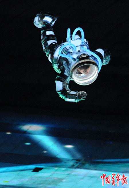 2008年8月8日,北京奥运会开幕式上,一位演员扮演成航天员从天而降。刘占崑/摄